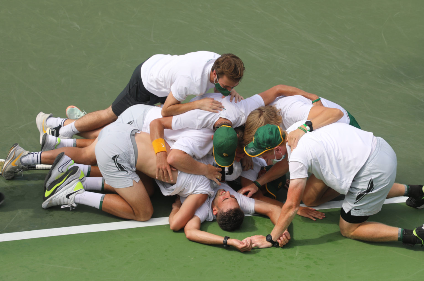 We Are The Champions: Baylor Men’s Tennis dog piles after clenching the Big 12 win against the University of Texas.
