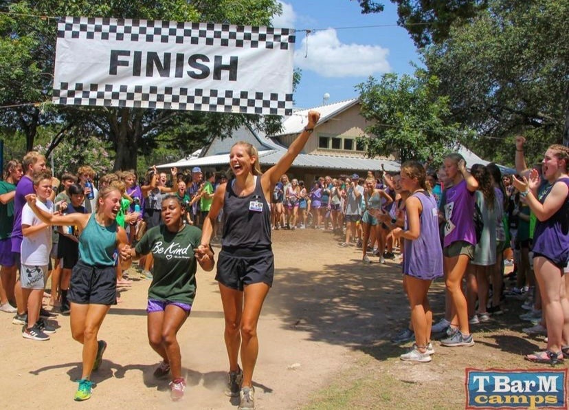 Victory! A camper experiencing Cerebral Palsy finishes the Iron Adventure Race alongside her counselors.