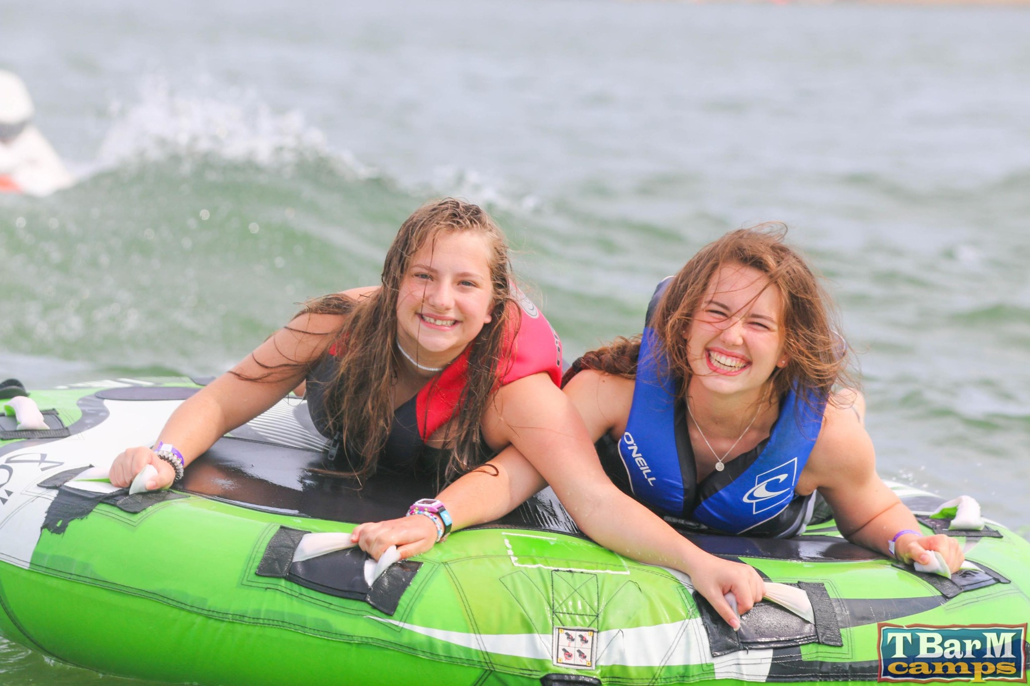 Hang on tight! Campers enjoy a tube ride on Lake Travis.