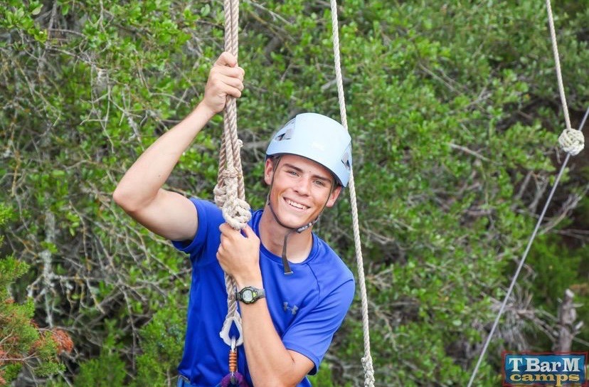 Up In The Sky: A camper treks across the tightrope, high above the trees.