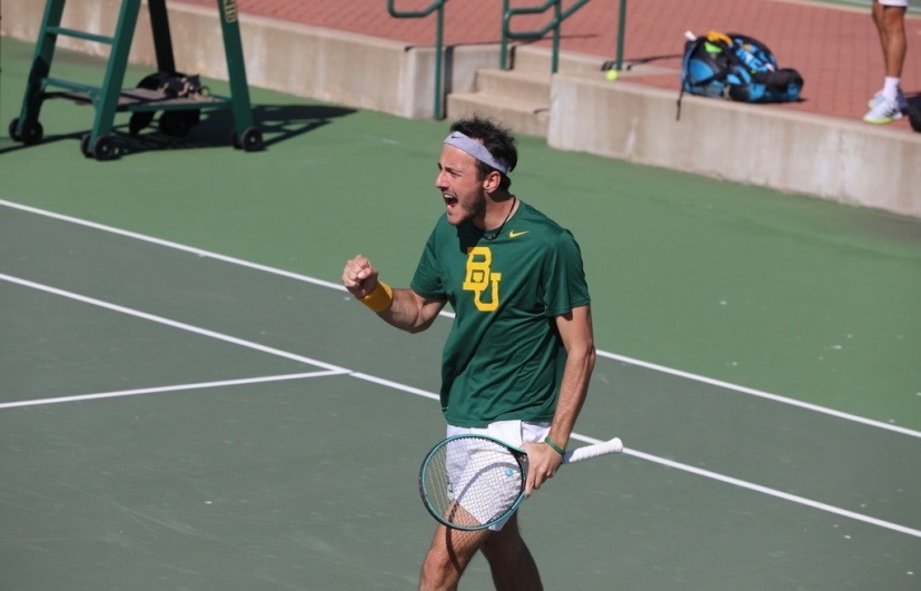 Baylor Senior Constantin Frantzen celebrates after scoring against Texas Christian University at the Hurd Tennis Center in Waco, Texas.
